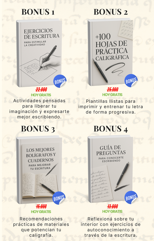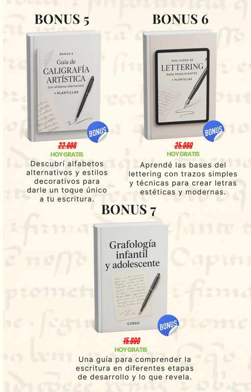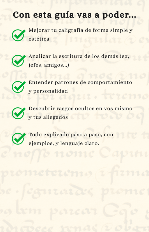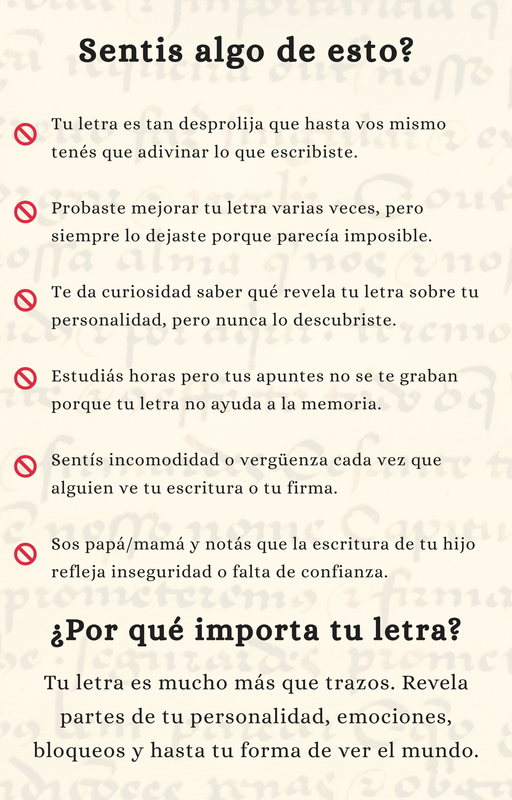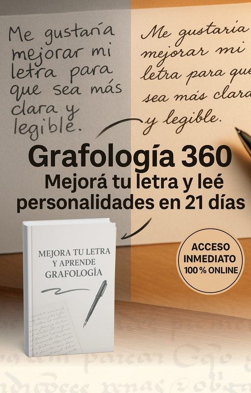 Vas a mejorar tu letra, comprender principios básicos de grafología y aprender a analizar la escritura de otras personas para identificar rasgos de personalidad, emociones y patrones de comportamiento.